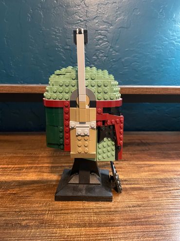 The helmet is also mounted on a sturdy display base with a Boba Fett nameplate, making it the perfect way to show off your love of Star Wars and LEGO building.